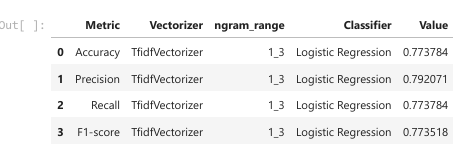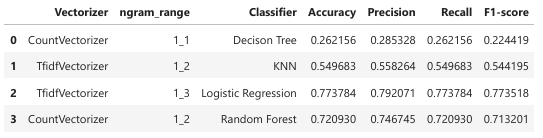 - Feature Extraction: TF-IDF Vectorizer with n-gram ranges (e.g., unigram, bigram, trigram).