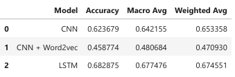 - CNN with Word2Vec underperformed (accuracy: 0.458774), likely due to misaligned embeddings or insufficient parameter tuning.