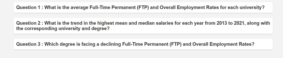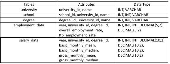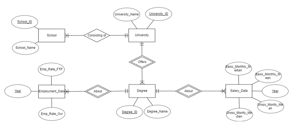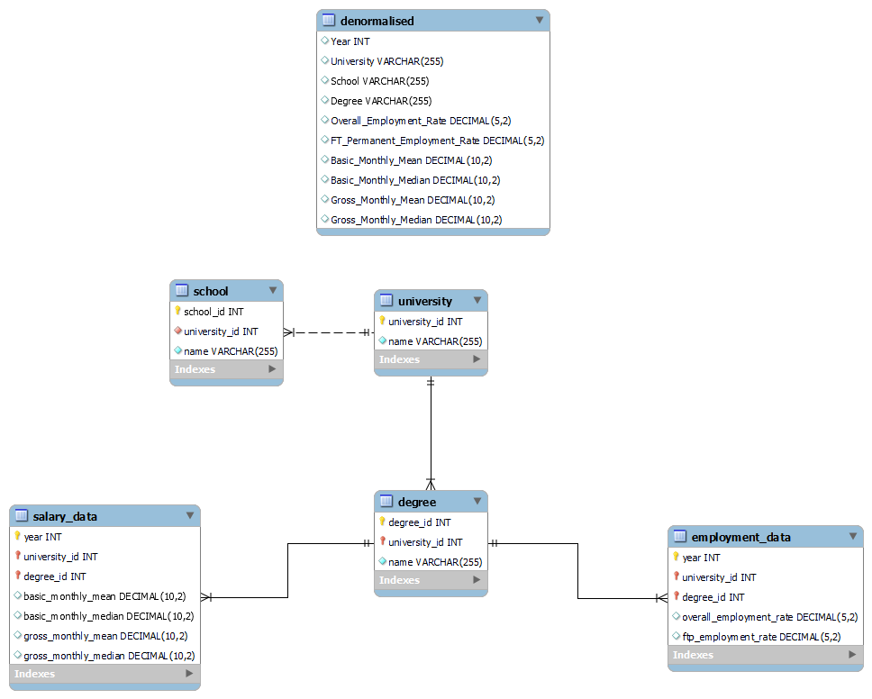 The dataset contains data regarding graduate employment outcomes, salaries, and related metrics. The goal was to critique the dataset, model its structure, implement it as a MySQL database, and create a simple Node.js-based web application to query and display insights from the data.