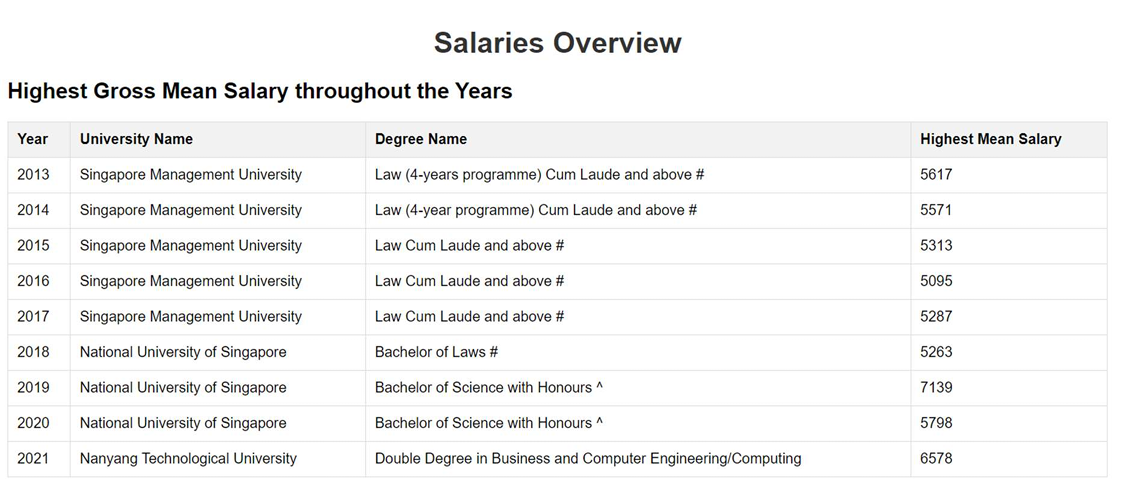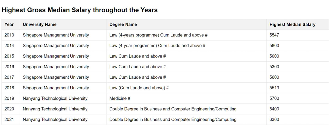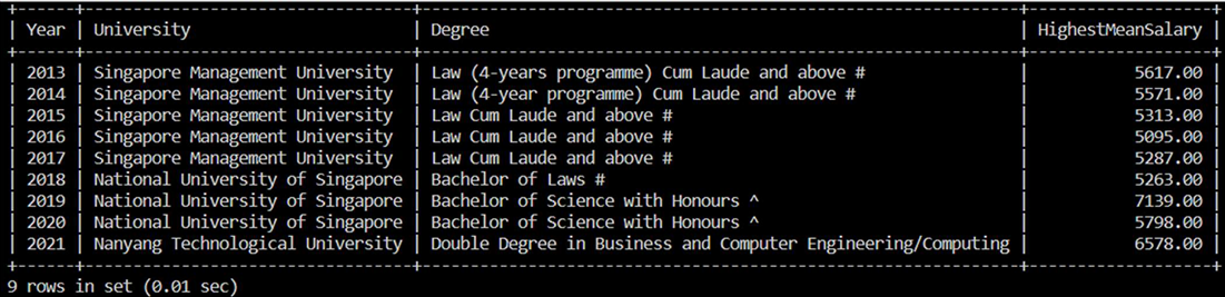 - What is the trend in the highest mean and median salaries for each year from 2013 to 2021, along with the corresponding university and degree?
